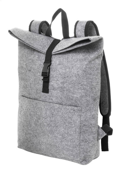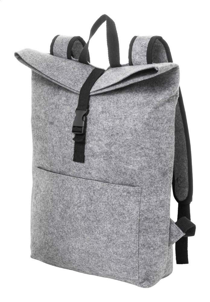 Rolltop-Rucksack aus RPET Filz mit Schnallenverschluss am Hauptfach, Reißverschluss-Fronttasche, Laptopfach (15") und gepolsterten Schultergurten. Mit RPET-Label.