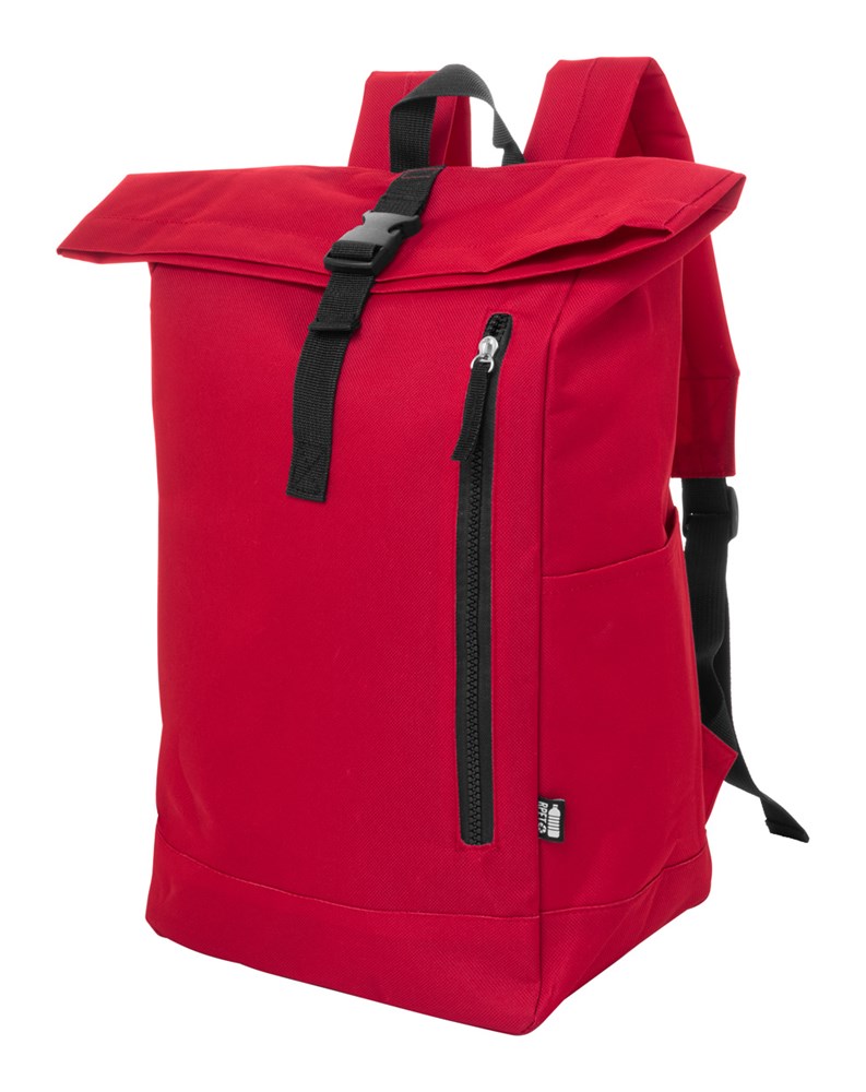 RPET-Rolltop-Rucksack mit Schnallenverschluss, Laptopfach (14") und Reißverschluss-Fronttasche. Mit gepolstertem Rücken und Schultergurten. Material: 600D RPET-Polyester. Mit RPET-Label.