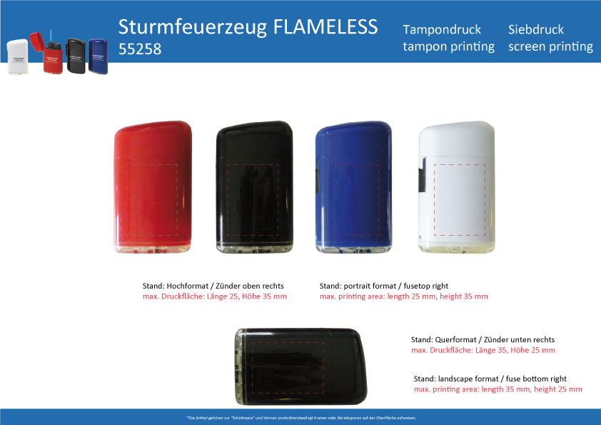 Sturmfeuerzeug „FLAMELESS“ - Wind und Wetterfestes Feuerzeug mit Klappverschluß und großer Werbefläche. (Format: 65 x 35 mm)