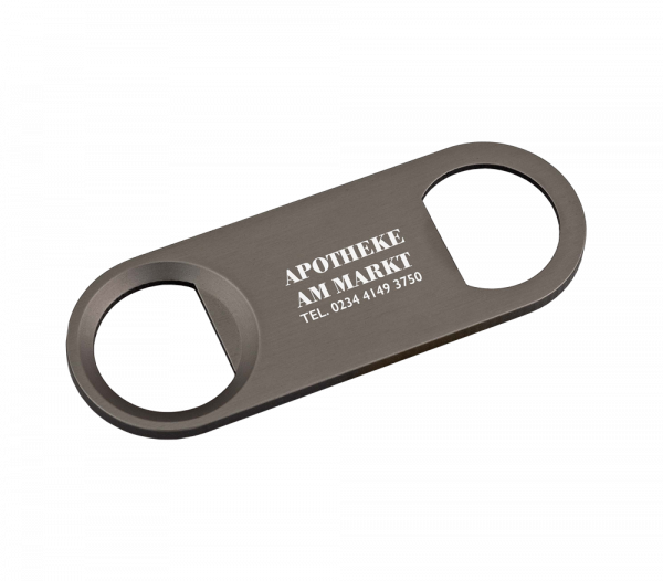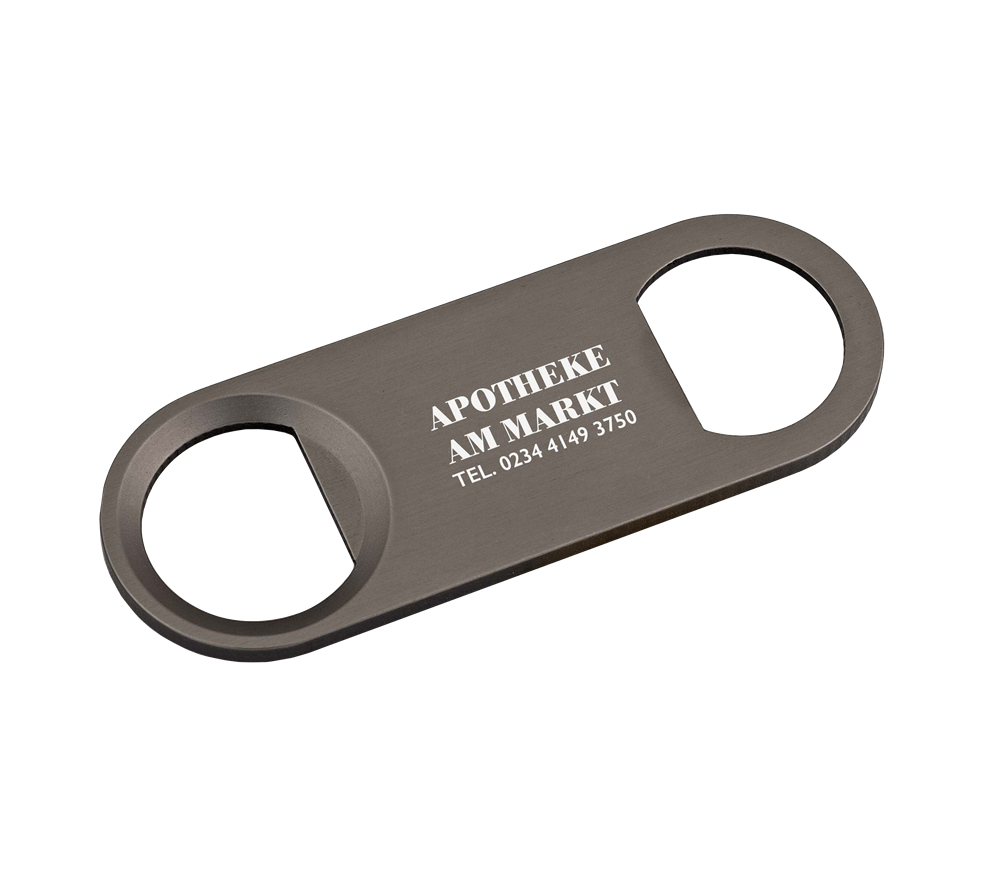 Flaschenöffner „DOUBLE“ in handlicher Form aus Aluminium hergestellt. Beidseitig zu benutzen mit großer Werbefläche. (Format: 90 x 33 x 3,5 mm)