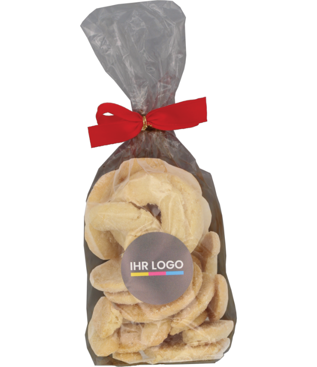 Usere Vanillekipferl, handgefertigt aus zartem, buttrigem Teig, verfeinert mit edler Vanille. Nach dem Backen in Puderzucker gewälzt, bieten sie ein unverwechselbares, köstliches Aroma. Individualisieren Sie diese durch einen 4c bedruckten Aufkleber.