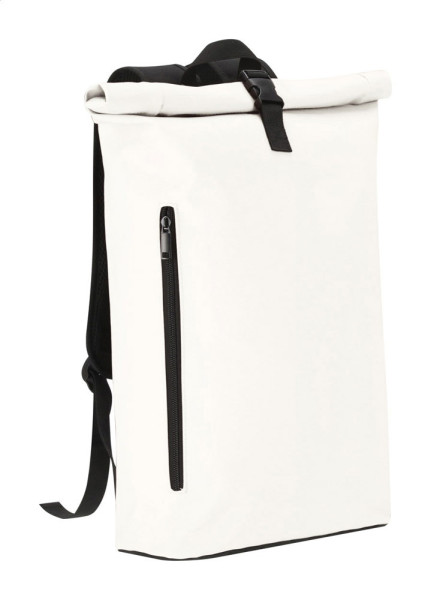 Rolltop-Rucksack aus weichem PU-Leder mit Schnallenverschluss, gepolstertem Laptopfach (15"), gepolstertem Rücken und Schultergurten.