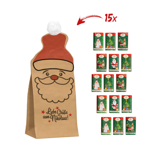 1 Nikolaustüte aus Papier mit Standard-Druck "Alles Liebe zum Nikolaus", gefüllt mit 15 Napolitains je 3 g (einzeln verpackte Mini-Täfelchen aus Edel-Vollmilch-Schokolade mit verschiedenen Weihnachtsmotiven, Sortierung kann von der Abbildung abweichen). • Die Nikolaus-Tüte kann mit einem 4c Druck, 1c Druck oder einem 4c Aufkleber individualisiert werden.