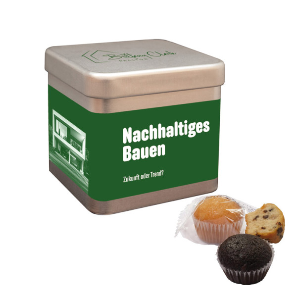 Silbermatte, quadratische Dose mit drei Veredelungsoptionen: Sie haben die Wahl zwischen Direkt-Digitaldruck auf dem Deckel, einem vierfarbigen 4-C-Etikett am Korpus oder einer Kombination aus beiden Veredelungen für maximale Markenwirkung. Befüllt wird diese kompakte Dose mit Mini-Muffins, drei verschiedenen Sorten, gemischt.
