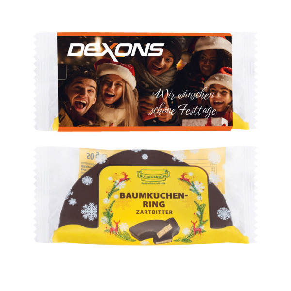 Halber Baumkuchen-Ring, original verpackt, im individuell bedruckten Werbeschuber. mehr