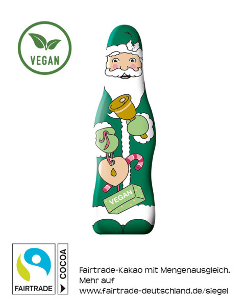 Vegane Schokoladen-Relief-Weihnachtsmann in bedruckter Folie. Fairtrade Edelvollmilchschokolade, mindestens 39% Kakao.