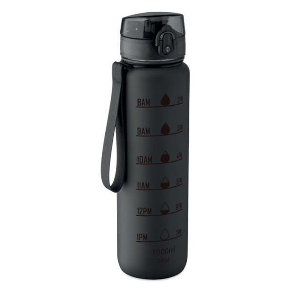 Sport-Trinkflasche aus RPET. Motivierende Zeitmarkierung, einhändig zu öffnender Flip-Top-Deckel, Sicherheitsverschluss und Trageriemen. Auslaufsicher. Füllmenge: 1L.
