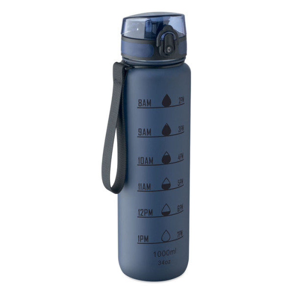 Sport-Trinkflasche aus RPET. Motivierende Zeitmarkierung, einhändig zu öffnender Flip-Top-Deckel, Sicherheitsverschluss und Trageriemen. Auslaufsicher. Füllmenge: 1L.