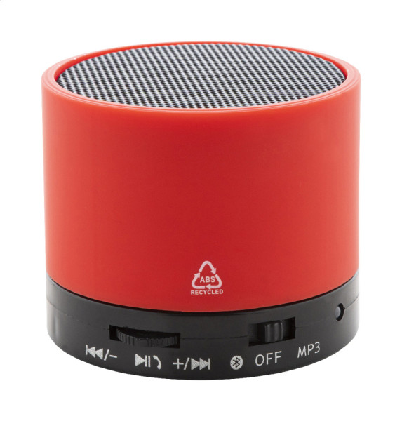 Kabelloser Lautsprecher aus recyceltem ABS in gummiertem Gehäuse mit Metallgitter und wiederaufladbarem Akku (300 mAh). Mit Freisprechfunktion und MP3-Wiedergabe über Micro-SD-Karte. Inklusive USB-Ladekabel.