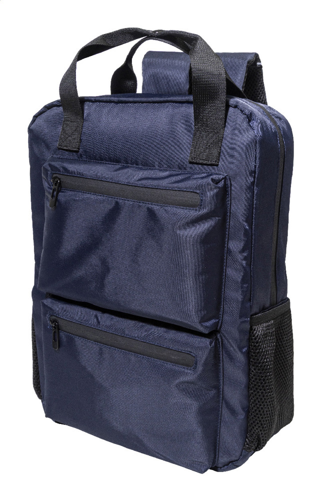 RPET-Rucksack mit Reißverschlussfach, 2 Reißverschluss-Fronttaschen, gepolstertem Laptopfach (15") und Netz-Seitentaschen. Mit gepolstertem Rücken und Schultergurten, Diebstahlschutztasche und Trolley-Gurt. Material: RPET-Twill-Polyester. Mit RPET-Label.