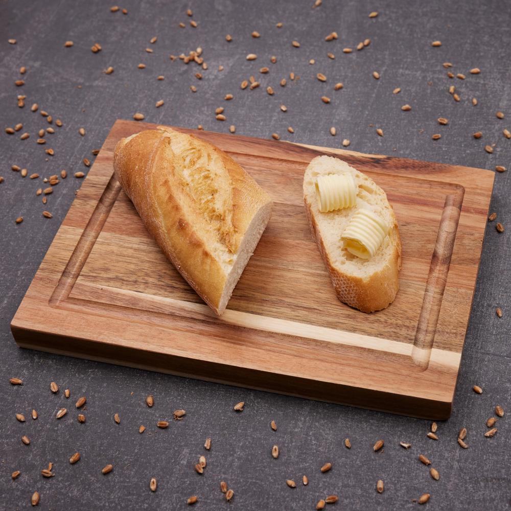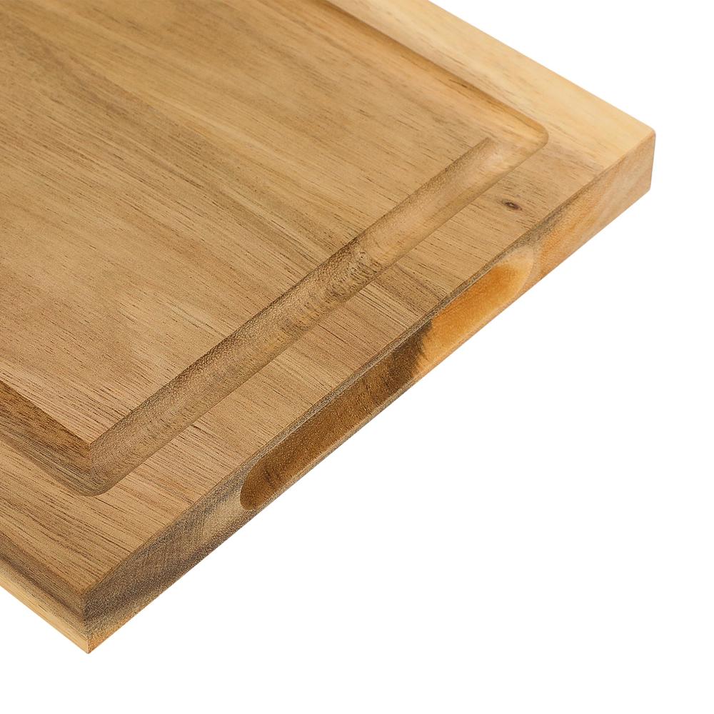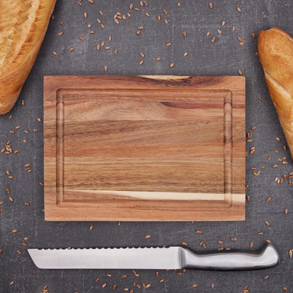 Stabiles Schneidbrett aus mit Sojabohnen-Öl behandeltem Akazienholz. Inkl.gefräster Saftrille und 2 seitlichen Griffkerben. Dieser Artikel wird aus einem Naturprodukt hergestellt und kann daher in Farbe und Aussehen variieren.