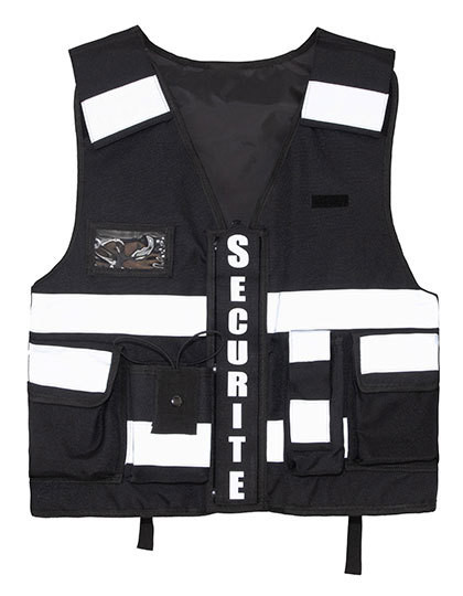 Stylische Tactical Weste für den Security- Breich mit markanten Reflexstreifen als Blickfang | Durchgehender Reißverschluss vorne, verstärkt durch eine Klappe | Flexibler Einsatz durch diverse Taschen | Rückenpatch mit weiß-reflektierendem Aufdruck: ' Securite Privee' , Reißverschlusspatch mit reflektierendem Aufdruck: ' Securite' und Brustpatch ohne Aufdruck lose im Polybeutel inklusive | Tear Off Label | Praktische Doppelgrößen mit Verstellverschluss zur individuellen Anpassung