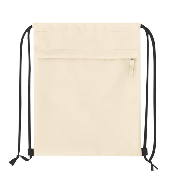 Kordelzug-Rucksack aus weichem PU kombiniert mit robustem 600D-Polyester. Mit funktionaler Fronttasche mit Reißverschluss und farblich passendem PU-Zipper.
