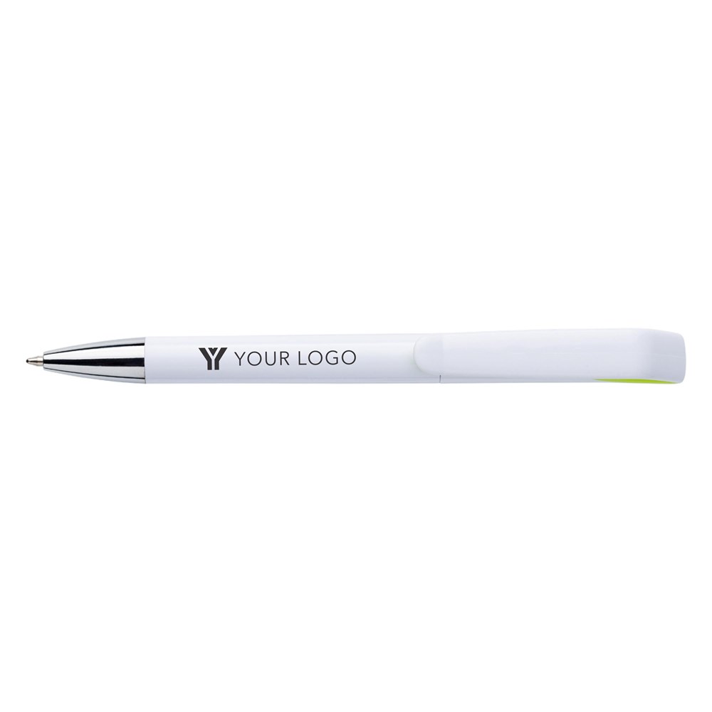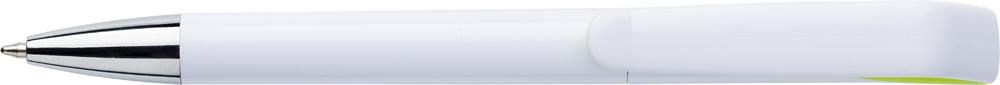 Drehkugelschreiber aus Kunststoff, mit farbigen Akzenten und blauer Mine.