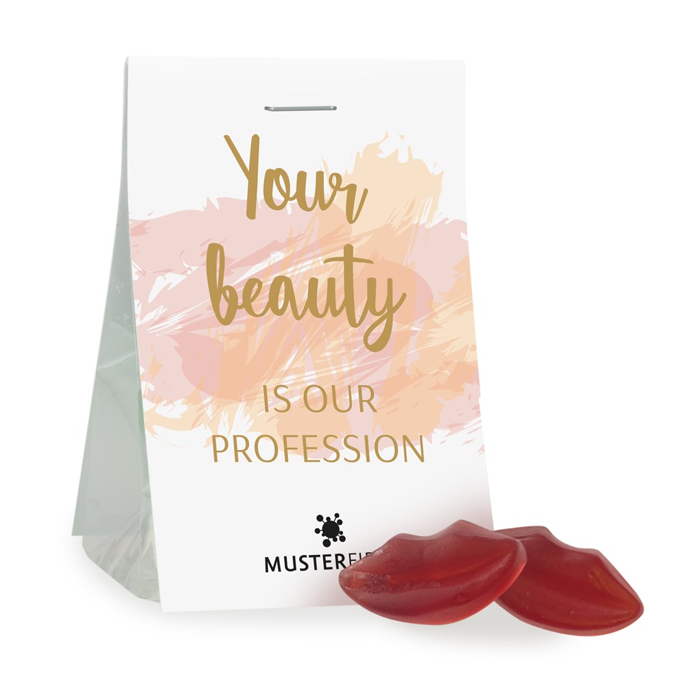 Lieferzeit: 14 Werktage nach Druckfreigabe Haltbarkeit: 12 Monate bei sachgerechter Lagerung Inhalt: 15 g Fruchtgummi mit Kirschgeschmack Druckfläche: 172 x 55 mm, Klappkarte beidseitig Größe: 86 x 55 x 35 mm VPE: 125