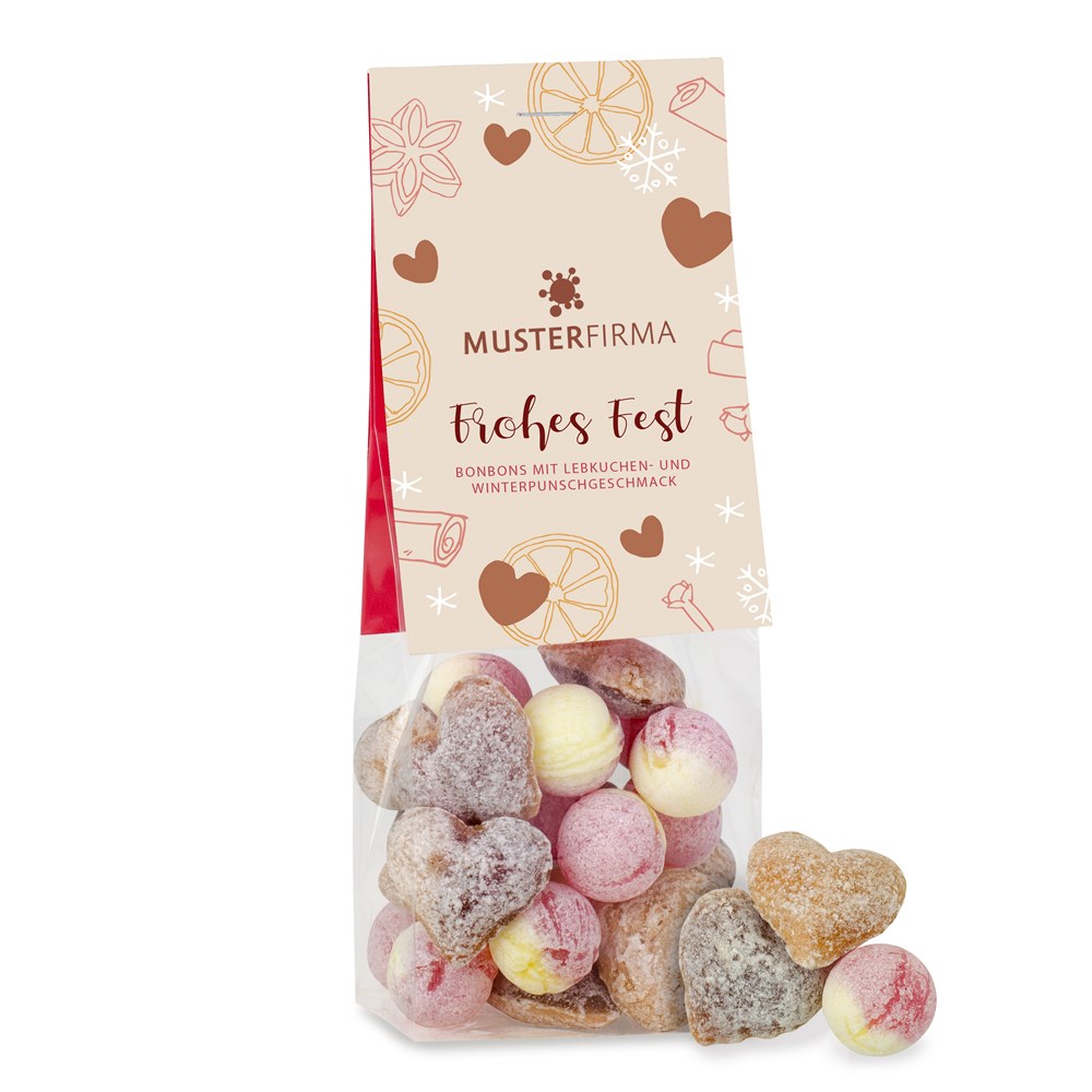 Unvergleichliche Geschmackskombi. Besonderer Beutel mit individuellem Design, gefüllt mit einer unwiderstehlichen Mischung aus Lebkuchen- und Winterpunsch-Bonbons.