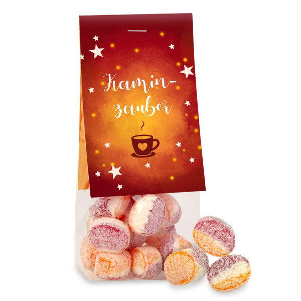 Für den süßen Winterzauber. Individuell bedruckter Beutel gefüllt mit winterlichen Bonbons - perfekt als personalisiertes Werbegeschenk für die kalte Jahreszeit! Lieferzeit: 14 Werktage nach Druckfreigabe Haltbarkeit: 12 Monate Inhalt: 50 g Bonbons mit Glühwein- und Orangengeschmack Druckfläche: 172 x 55 mm Größe: 125 x 55 x 35 mm VPE: 50 Zutaten: Zucker, Glukosesirup, Säuerungsmittel: Citronensäure; Aroma, Vanillin, Orangenöl, Rote Bete Saftkonzentrat, natürliches Paprika Aroma. Nährwerte pro 100 g: Energie: 1630 kJ/384 kcal; Fett: 0 g, davon gesättigte Fettsäuren: 0,0 g; Kohlenhydrate: 90,26 g, davon Zucker: 65,2 g; Eiweiß: 0 g; Salz: 0 g