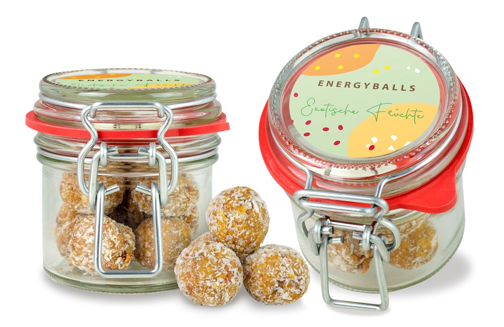 Exotische Werbeartikel für mehr Energie! Bereiten Sie Ihren Kund:innen und Partner:innen eine Freude mit den lecker-fruchtigen Energyballs - nachhaltig wie Ihre Botschaft.