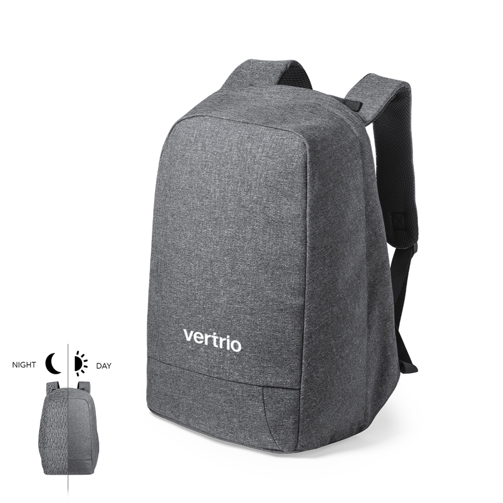 Gut sichtbarer, reflektierender Anti-Diebstahl-Rucksack aus strapazierfähigem, hochwertigem 600D-Polyester mit grauem Finish. Hergestellt unter Verwendung von Glühfäden mit hoher Lichtreflexionsfähigkeit dank Millionen reflektierender Pigmente und basierend auf dem Prinzip der Retroreflexion von Licht, einer Eigenschaft der Nachtsichtbarkeit, die in der Brechung des Lichts in Richtung der Lichtquelle besteht. Spritzwassergeschützt, mit Anti-Diebstahl-Tasche und Trolley-Befestigung. Gepolsterte Innenfächer für Laptops bis zu 15" und Tablets bis zu 12". Gepolsterte Schulter- und Rückengurte.