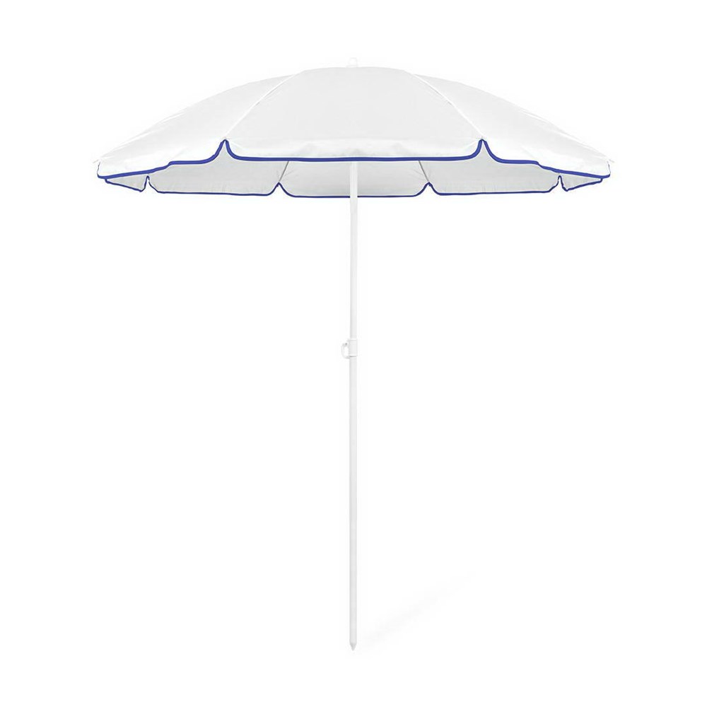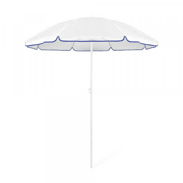 Sonnenschirm mit 8 Panelen aus robustem Nylon in verschiedenen lebendigen Farben. Mit einem Durchmesser von 150 cm, Paspelierung an den Rändern und höhenverstellbaren Metallrohren in Weiß. Präsentiert in einer PVC-Hülle mit Schultergurt.