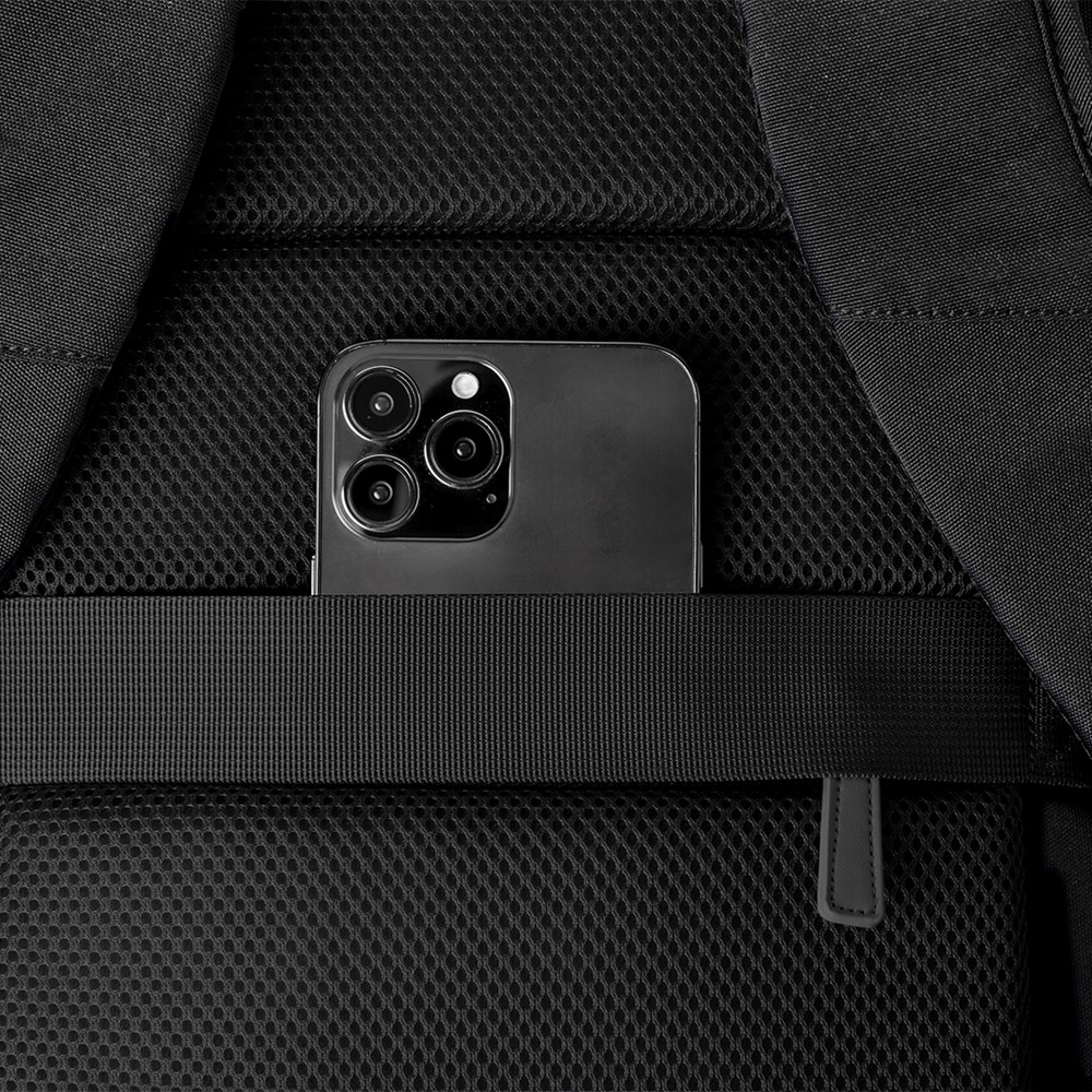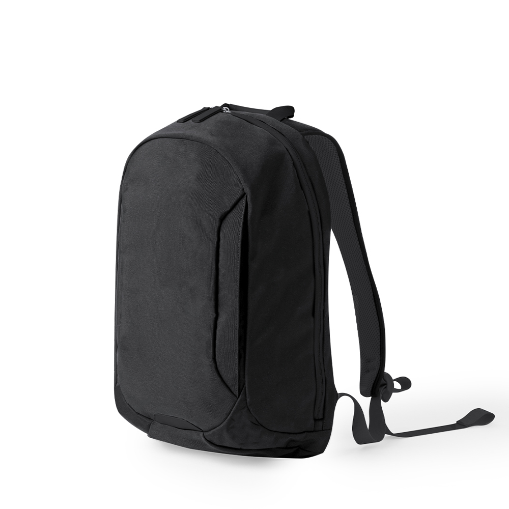 Rucksack aus strapazierfähigem Polyester, ausgestattet mit doppeltem Reißverschlussschieber und einer Vordertasche. Im Inneren befindet sich ein gepolstertes Fach für Laptops bis 15 Zoll und ein Fach für Tablets bis 10 Zoll. Auf der Außenseite verfügt es über eine Vordertasche für schnellen Zugriff und eine versteckte Tasche auf der gepolsterten Rückseite zur Aufbewahrung von Wertsachen, mit einem Riemen zur Gepäckbefestigung. Verstärkte Ecken sorgen für zusätzliche Haltbarkeit und ein Tragegriff mit stilvollen schwarzen Beschlägen ist im Lieferumfang enthalten. Schulter- und Rückengurte sind gepolstert und für mehr Komfort verstellbar. Präsentiert in einer einzelnen recycelten Tasche.