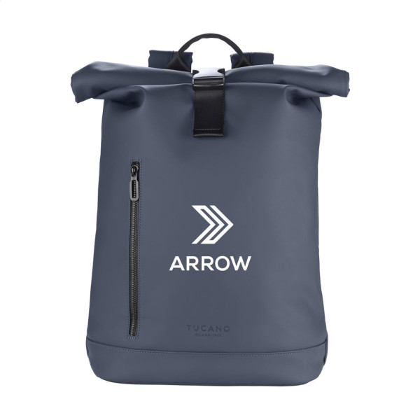 Sportlicher 'Rolltop'-Rucksack mit robustem Kunststoffverschluss der italienischen Marke Tucano. Hergestellt aus gummiartigen Materialien, die aus recyceltem Kunststoff, darunter 22 recycelte PET-Flaschen, hergestellt werden. Das wasserabweisende Material an der Außenseite ist überraschend geschmeidig und verleiht der Tasche einen eleganten und modernen Look. Ausgestattet mit einem großen Einzelfach mit einem internen, stoßfesten Laptopfach (bis zu 15,6 Zoll oder MacBook Pro 16 Zoll) mit einem Netzfach und einem geräumigen Reißverschlussfach an der Vorderseite für wichtige Accessoires. Komplett gefüttert. Die verstellbaren, gepolsterten Schultergurte und die atmungsaktive Netzrückseite sorgen für zusätzlichen Tragekomfort. Mit Trolley-Gurt und Trageschlaufe. PVC-frei. Ein idealer Rucksack für den täglichen Gebrauch. Fassungsvermögen ca. 22,5 Liter.