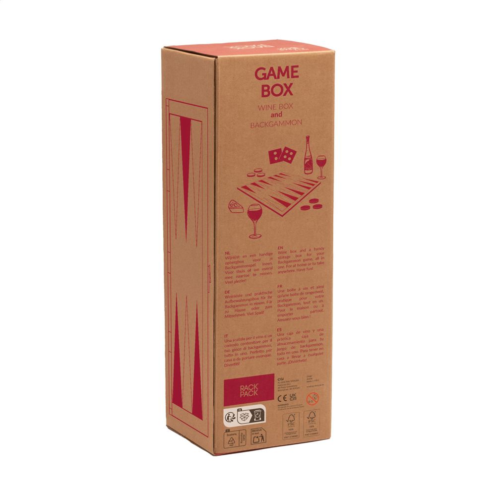 Rackpack Gamebox Backgammon: Weinkiste und Backgammonspiel in einem. Eine Geschenkverpackung für eine einzelne Flasche Wein. Wenn Sie die Box aufklappen, erhalten Sie ein komplettes Brettspiel. Wird mit Backgammon-Spielsteinen aus Holz in einer robusten Aufbewahrungstasche aus Segeltuch geliefert. Ein komplettes Geschenk für einen gelungenen Spieleabend. Rackpack: eine Wein-Geschenkbox aus FSC 100% zertifiziertes Holz mit einem neuen zweiten Leben! • geeignet für eine Flasche Wein • Kiefernholz • Wein nicht inklusive. Verpackt pro Stück.
