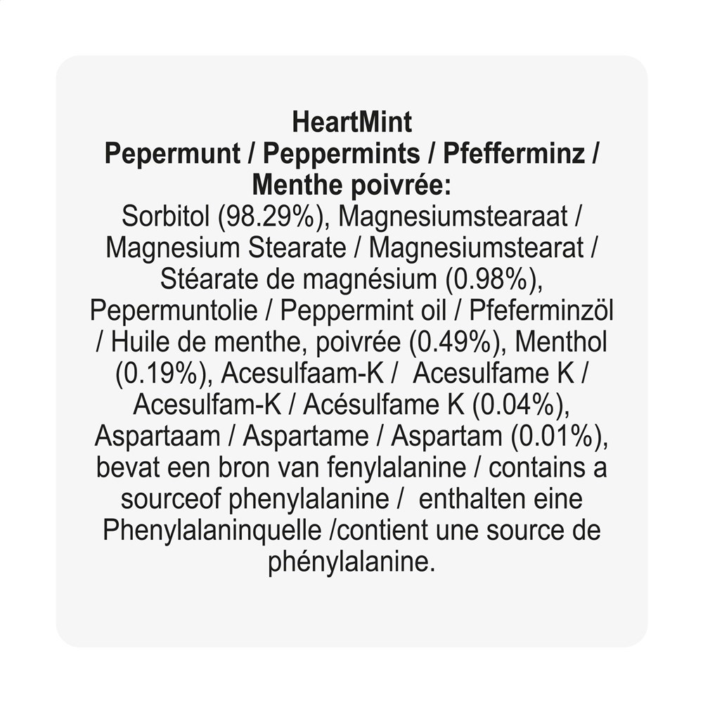 Ein kompakter und flacher herzförmiger Spender aus Kunststoff, gefüllt mit ca. 8 Gramm (50 Stück) zuckerfreien Pfefferminzdrops.