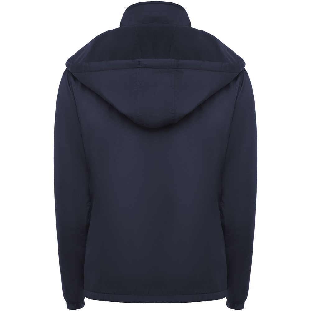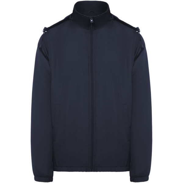 Leichte, wasserabweisende Jacke. Hoher Kragen und einrollbare, verstellbare Kapuze. Innenfutter aus Microfleece. Front-Reißverschluss und Kinnschutz. Elastische Ärmelbündchen. Zwei Seitentaschen mit Reißverschluss. Innere Brusttasche links. Herausnehmbares Etikett. Wasserabweisend. Winddicht. Das männliche Modell ist 184 cm groß und trägt Größe L, das weibliche Modell ist 174 cm groß und trägt Größe S.