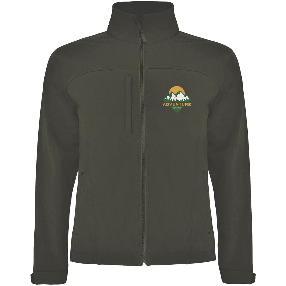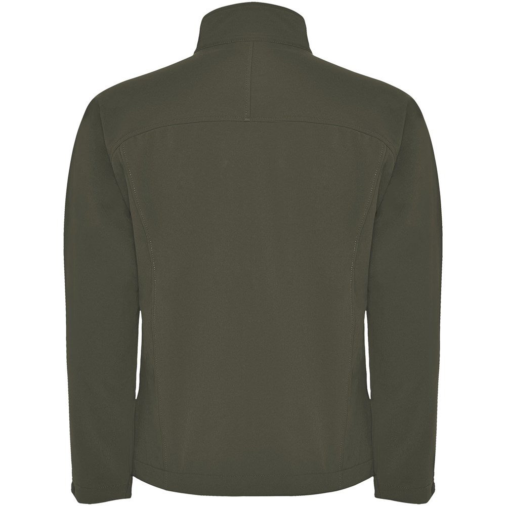 3-lagige Softshell-Jacke: Durchgehender Reißverschluss mit Kinnschutz und Zipper. Außentasche auf der Brust mit Reißverschluss und Zipper. Außentaschen mit Reißverschluss und Zipper. Klettverschlüsse an den Ärmelbündchen. Ausschnitt oder Paspel auf der Vorderseite der Brust. Ausschnitt oder vorgeformter Einsatz am Rücken. Saum mit elastischer Kordel und verstellbaren Stoppern innen. 1000 mm Wassersäule. Winddicht. Das Modell ist 184 cm groß und trägt Größe L.
