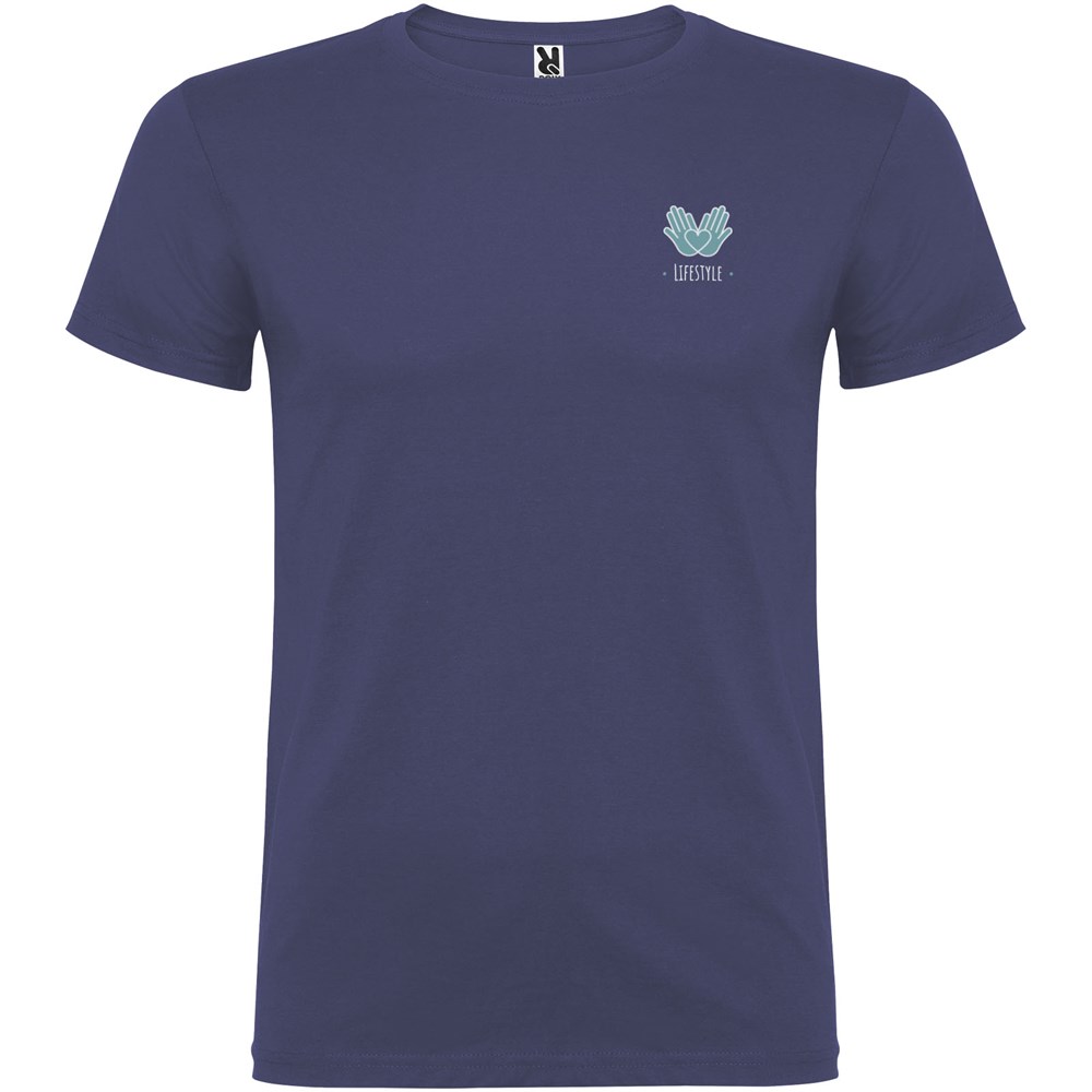 Kurzärmeliges T-Shirt mit doppellagigem Rundhalsausschnitt aus Elasthan, hergestellt aus mit Seitennähten. Verstärkte und verdeckte Nähte am Kragen. Herausnehmbares Etikett. Das Modell ist 120 cm groß und trägt Größe 5/6.