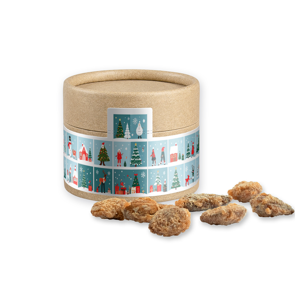 Kraftpapierdose Mini aus Papier. Werbeanbringung als Etikett in 4c individuell bedruckbar.