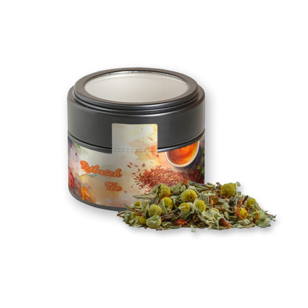 Rotbuschtee Entspannungszeit, ca. 25g, Metalldose Mini mit Sichtfenster schwarz