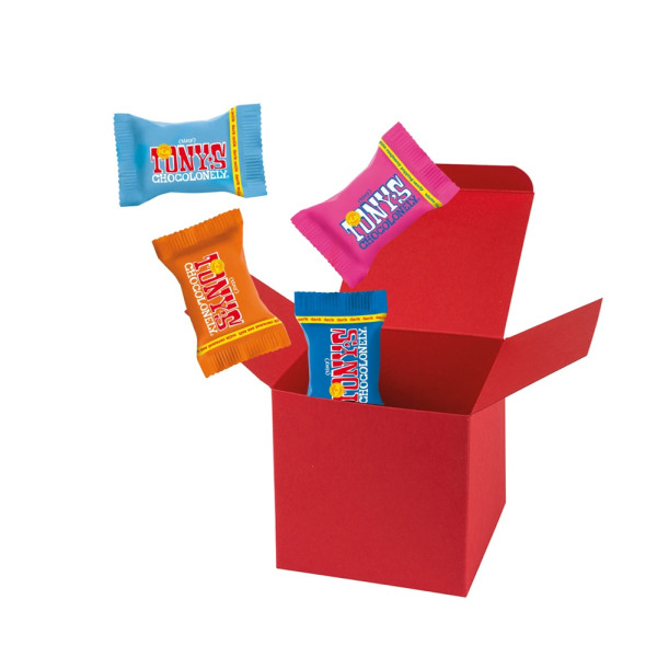 4 Tiny Tony´s verpackt in ColorBox Rot. • Quadratisch, flexibel und nachhaltig: die ColorBox ist ein Naturprodukt "MADE IN GERMANY" welches aus 100% Recyclingpapier hergestellt wird,gefüllt mit 4 Tiny Tony's, das sind Mini‑Schokoladentäfelchen in unterschiedlichen Sorten: Milch, Milch Karamell Meersalz, Milch Nougat, Milch Haselnuss, Zartbitter Mandel Meersalz, Dunkle Milch, Dunkle Milch Brezel, Dunkle Milch Brezel, Weiße Schokolade und Weiße Schokolade Himbeere Knusper (Sortierung kann von der Abbildung abweichen). Die ColorBox kann auf Wunsch mit einem 4c Aufkleber oder 1c Druck individualisiert werden, weitere mögliche Werbeanbringungen sind eine Banderole 4c um die Box herum und ab 3000 Stück ein All-Over Druck 4c.