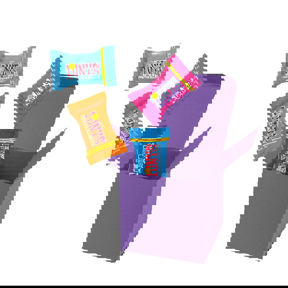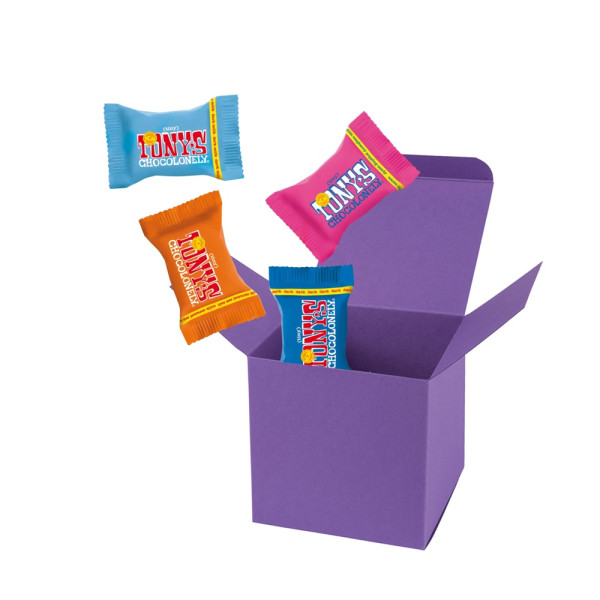 4 Tiny Tony´s verpackt in ColorBox Lila. • Quadratisch, flexibel und nachhaltig: die ColorBox ist ein Naturprodukt "MADE IN GERMANY" welches aus 100% Recyclingpapier hergestellt wird,gefüllt mit 4 Tiny Tony's, das sind Mini‑Schokoladentäfelchen in unterschiedlichen Sorten: Milch, Milch Karamell Meersalz, Milch Nougat, Milch Haselnuss, Zartbitter Mandel Meersalz, Dunkle Milch, Dunkle Milch Brezel, Dunkle Milch Brezel, Weiße Schokolade und Weiße Schokolade Himbeere Knusper (Sortierung kann von der Abbildung abweichen). Die ColorBox kann auf Wunsch mit einem 4c Aufkleber oder 1c Druck individualisiert werden, weitere mögliche Werbeanbringungen sind eine Banderole 4c um die Box herum und ab 3000 Stück ein All-Over Druck 4c.