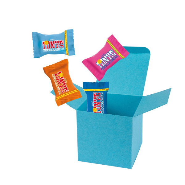 4 Tiny Tony´s verpackt in ColorBox Hellblau. • Quadratisch, flexibel und nachhaltig: die ColorBox ist ein Naturprodukt "MADE IN GERMANY" welches aus 100% Recyclingpapier hergestellt wird,gefüllt mit 4 Tiny Tony's, das sind Mini‑Schokoladentäfelchen in unterschiedlichen Sorten: Milch, Milch Karamell Meersalz, Milch Nougat, Milch Haselnuss, Zartbitter Mandel Meersalz, Dunkle Milch, Dunkle Milch Brezel, Dunkle Milch Brezel, Weiße Schokolade und Weiße Schokolade Himbeere Knusper (Sortierung kann von der Abbildung abweichen). Die ColorBox kann auf Wunsch mit einem 4c Aufkleber oder 1c Druck individualisiert werden, weitere mögliche Werbeanbringungen sind eine Banderole 4c um die Box herum und ab 3000 Stück ein All-Over Druck 4c.