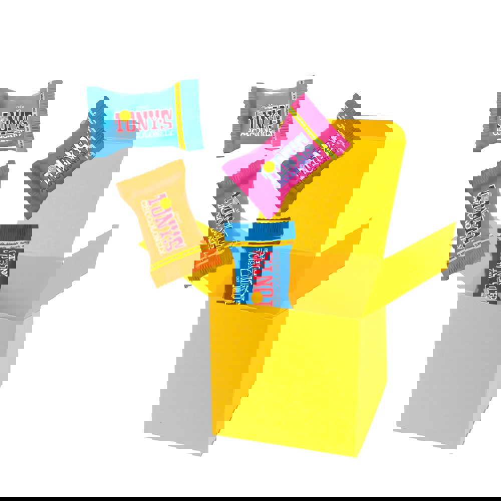 4 Tiny Tony´s verpackt in ColorBox Gelb. • Quadratisch, flexibel und nachhaltig: die ColorBox ist ein Naturprodukt "MADE IN GERMANY" welches aus 100% Recyclingpapier hergestellt wird,gefüllt mit 4 Tiny Tony's, das sind Mini‑Schokoladentäfelchen in unterschiedlichen Sorten: Milch, Milch Karamell Meersalz, Milch Nougat, Milch Haselnuss, Zartbitter Mandel Meersalz, Dunkle Milch, Dunkle Milch Brezel, Dunkle Milch Brezel, Weiße Schokolade und Weiße Schokolade Himbeere Knusper (Sortierung kann von der Abbildung abweichen). Die ColorBox kann auf Wunsch mit einem 4c Aufkleber oder 1c Druck individualisiert werden, weitere mögliche Werbeanbringungen sind eine Banderole 4c um die Box herum und ab 3000 Stück ein All-Over Druck 4c.