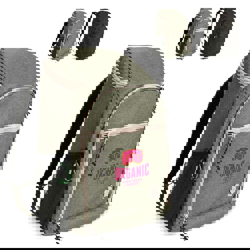 Ein wirklich luxuriöser und sportlich cooler Rucksack in grünem rPET-Material aus der Sagaform-Serie City rPET. Der Rucksack hat viele neue und tolle Details, die ihn in Wald und Feld noch nützlicher machen. Zwei Außentaschen, Netztasche an den Seiten, Karabiner zum Verstauen eines Bechers oder anderer Gegenstände, Innengurte, verbesserte Rückenpartie und verstellbare Schultergurte. Reißverschlüsse und gerippte Schnüre sind stilvolle Details in Kontrastfarben. Der Transport von Kühlgut war noch nie so einfach.
