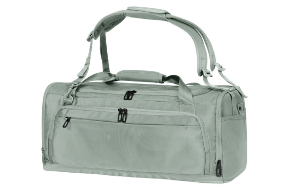 komfortable Sport- und Reisetasche mit Rucksackfunktion; recycelter Oberstoff; großes Hauptfach mit 2-Wege-Reißverschlussöffnung; seitliche Reißverschluss-Tasche inklusive Schuhbeutel; Vorderseite: große Vortasche mit 2-Wege-Reißverschluss sowie flache Reißverschluss-Tasche; Innen: hängender Reißverschluss-Organizer und geräumiges Reißverschluss-Deckelfach; gepolsterter Boden; Netzseitentasche zur Aufbewahrung der abnehmbaren, versenkbaren und gepolsterten Träger – ergonomisch geformt und wahlweise als Rucksack- oder Schulterträger nutzbar; Tragegriffe mit gepolsterter Griffmanschette