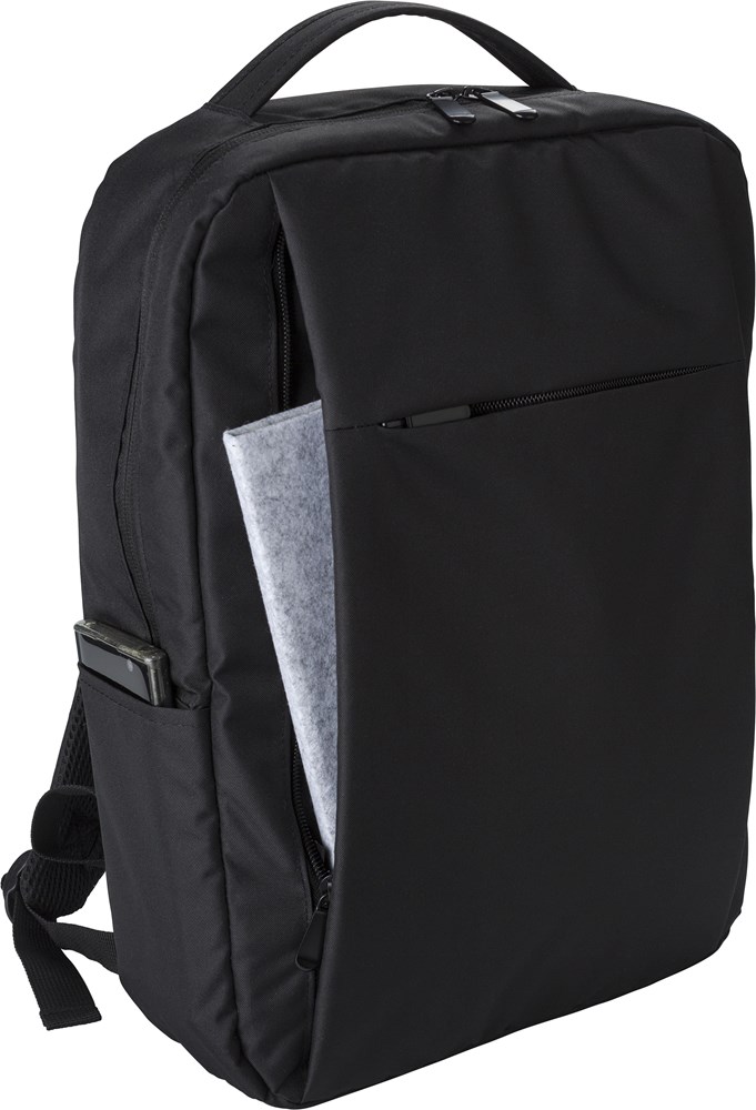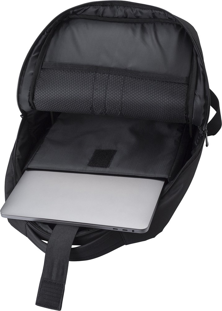 rPET (300D) Laptop (16 Zoll) Rucksack mit 210D Details. Innen mit mehreren Taschen, Laptop-Tasche mit Klettverschluss, eine Fronttasche mit Reißverschluss. Öffnung mit USB-A an der Seite.