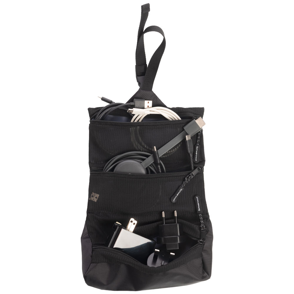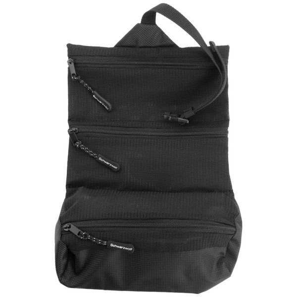 Praktische Schwarzwolf outdoor Multitasche für Kosmetikartikel und kleine Gegenstände in Schwarz, ideal für komfortables Reisen. Sie verfügt über drei Netztaschen mit Reißverschluss. Außerdem ist ein Schnallenverschluss enthalten, der zum Schließen der gerollten Tasche oder zum Erstellen einer Aufhängeschlaufe verwendet werden kann.