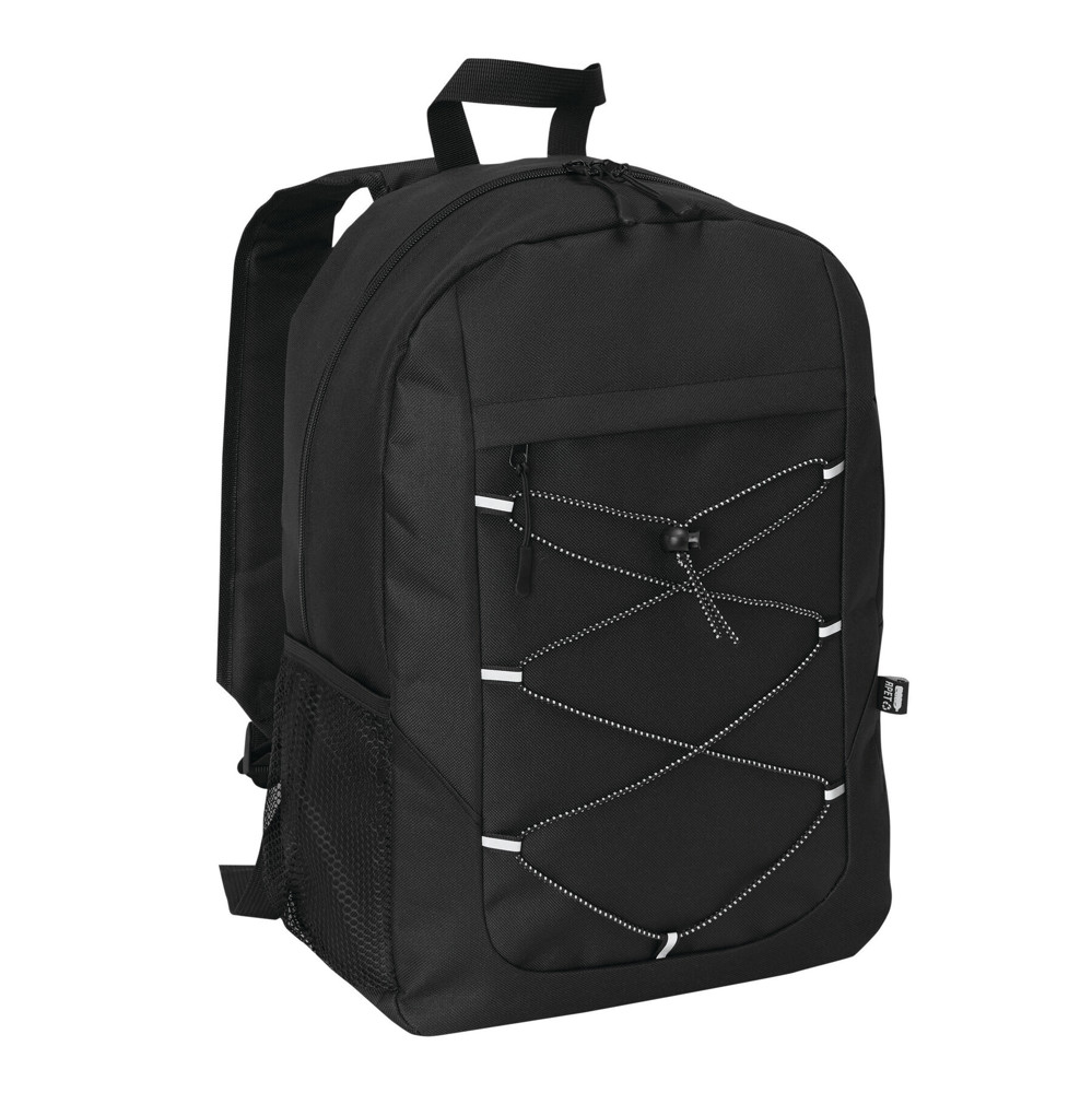 Rucksack FARO: aus recyceltem Polyester (RPET), Reißverschluss-Hauptfach, Reißverschluss-Vorfach mit verstellbarem, elastischem Kordelzug, Trageschlaufe, 1 seitliches Netzfach, gepolsterter Boden, verstellbare gepolsterte Schultergurte