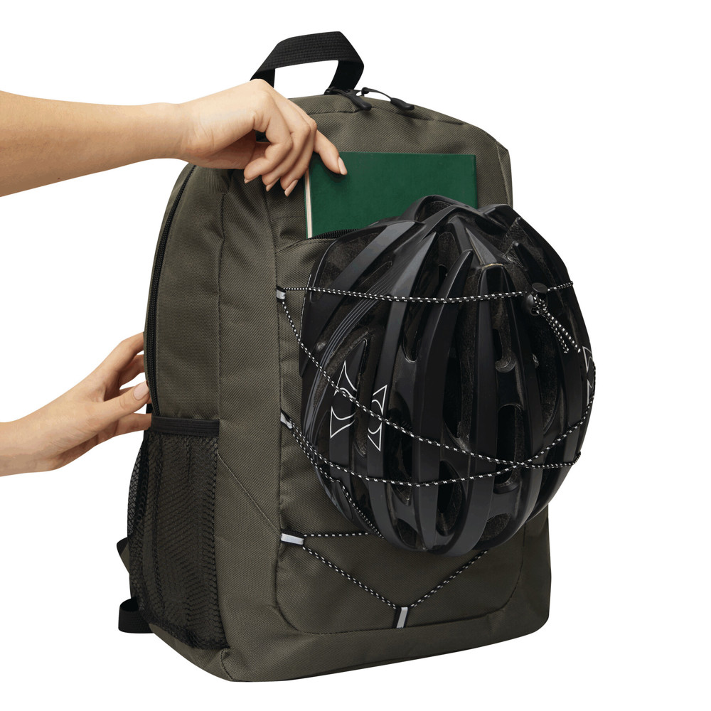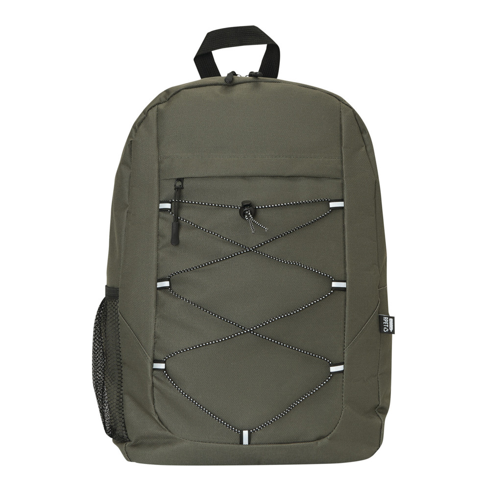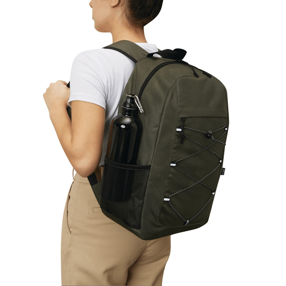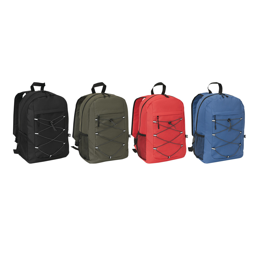 Rucksack FARO: aus recyceltem Polyester (RPET), Reißverschluss-Hauptfach, Reißverschluss-Vorfach mit verstellbarem, elastischem Kordelzug, Trageschlaufe, 1 seitliches Netzfach, gepolsterter Boden, verstellbare gepolsterte Schultergurte