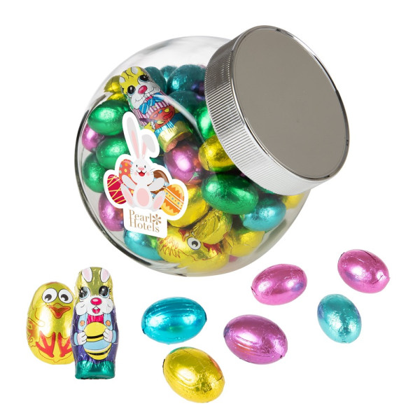 Medium Glas 0,9 Liter mit silbernem Deckel, gefüllt mit ca. 525 Gramm Schokoladen-Ostermischung und einem 4c-Euroskala Aufkleber auf beiden Seiten
