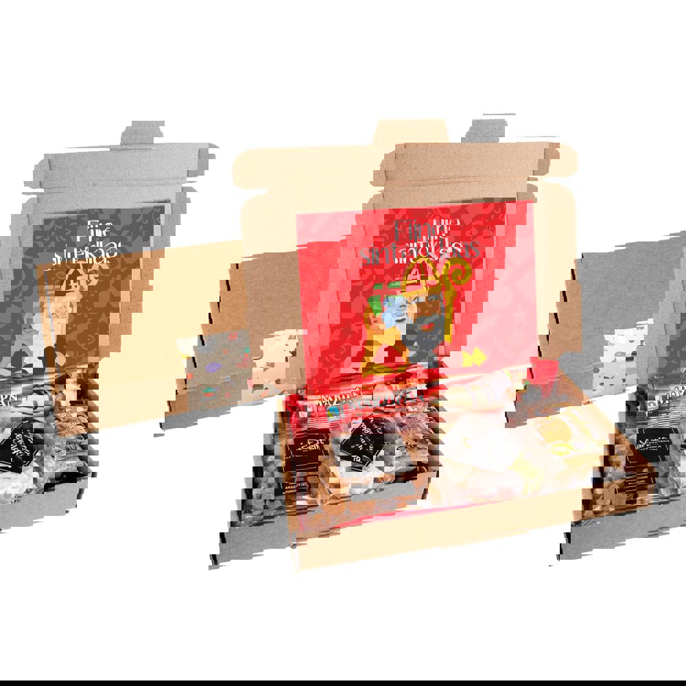 Brauner Versandkarton A5, gefüllt mit einer Beutel "Kruidnoten", einem Oat King Spekulatius Riegel, einer Beutel "Schuimpjes" und einer Marzipanriegel. Mit doppelseitig bedruckter A5-Karte und Standard Sint Sticker verschlossen.