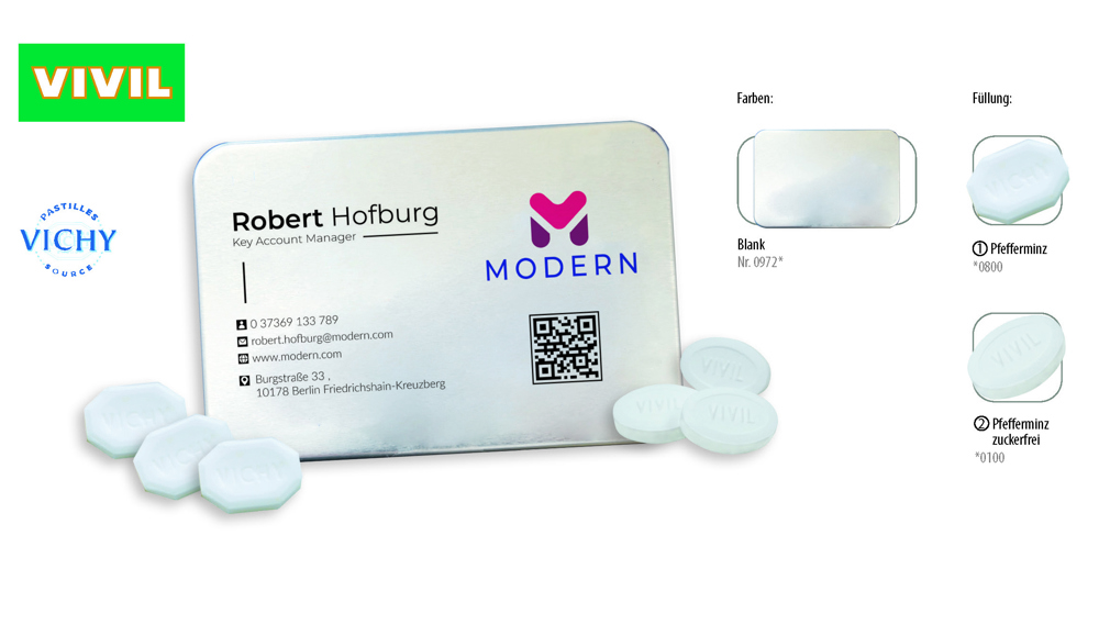 Eine stilvolle Klappdose, die nicht nur Pfefferminzpastillen von Vichy oder VIVIL enthält, sondern auch als kreative Visitenkarte verwendet werden kann. Die große Druckfläche bietet viele Möglichkeiten, die Dose individuell zu gestalten. , Geschmack: Pfef