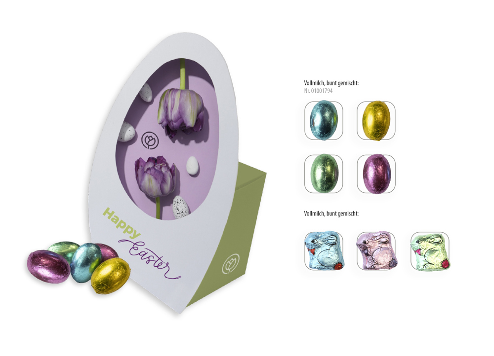 Das große Osterei bietet eine besonders großzügige Werbefläche. Doch auch der Inhalt kommt nicht zu kurz. In der kleinen Schachtel auf der Rückseite des Ostereis verbergen sich süße, bunte Schokoladeneier im Miniaturformat oder kleine Schokohäschen. , Ges