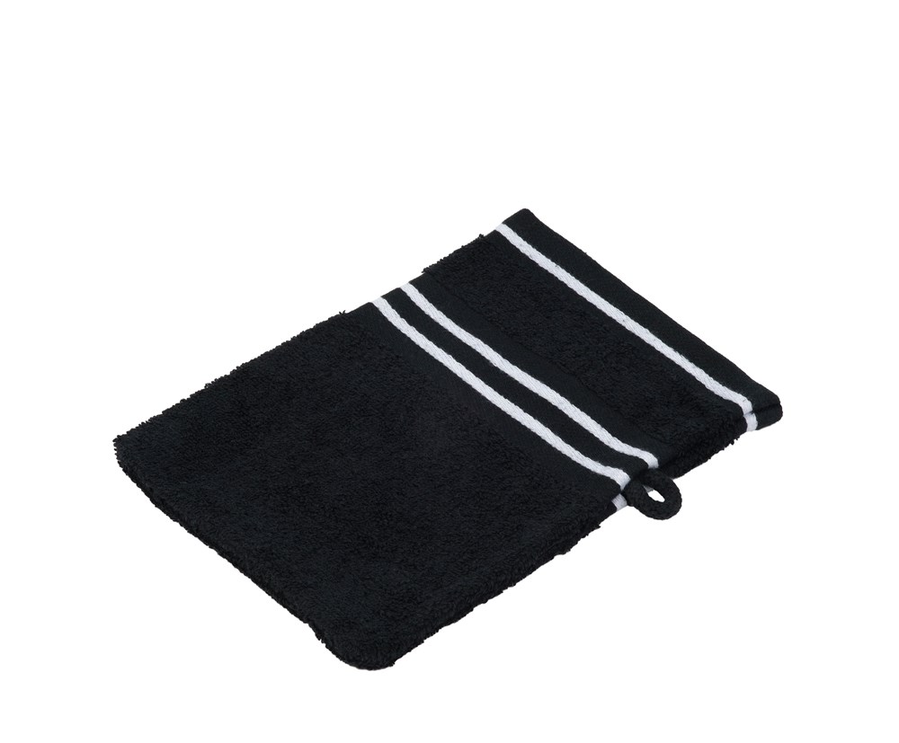 Farbiger Frottier-Waschhandschuh aus 100% hochwertiger Baumwolle mit weißer Streifen-Bordüre, ca. 500 g/m²