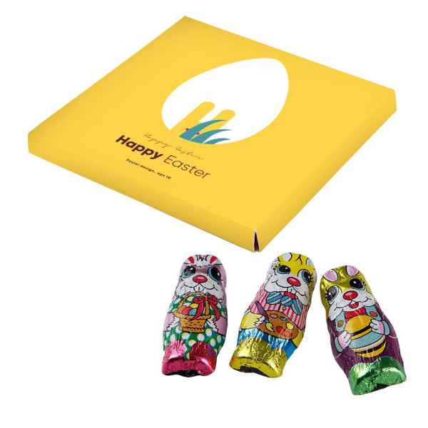 Große, flache, quadratische Schachtel mit vollflächigem Vollfarbdruck, gefüllt mit 10 in Folie verpackten Schokoladen-Osterhasen.