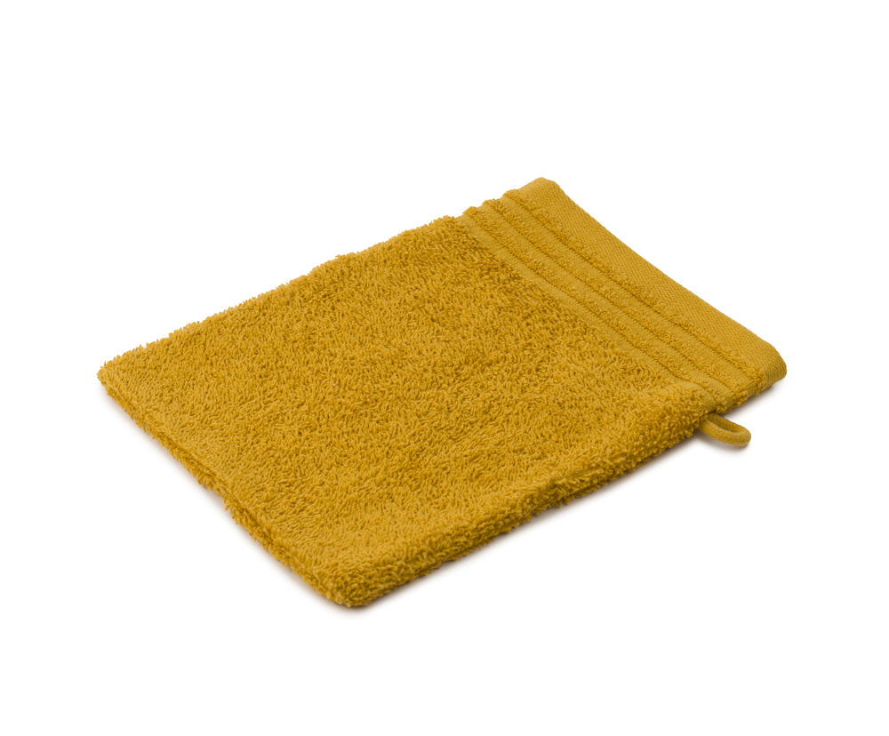 Uni-Walk-Frottier Waschhandschuh mit spannungsfreier 3-Streifen-Tiefgang-Bordüre, 4-seitig gesäumt, bestehend aus 100% hochwertiger Baumwolle, Größe 16x21cm, ca. 400 g/m², Farbe senf